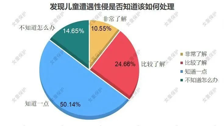 首先,很多小孩在遭受性侵后,自己可能并不知情。甚至有些家长,在得知孩子遭遇侵害后,也会变得手足无措。2021年,“女童保护”通过线上问卷对学生、家长和教师进行防性侵教育调查。在收到的8288份有效反馈中,只有10.55%的受访者表示假如遇到性侵儿童事件,非常了解应该如何处理,而有14.65%的人认为自己不知道在遇到儿童遭遇性侵害后该怎么办。总体来看,64.79%的人不太了解如何应对和处理性侵儿童事件。