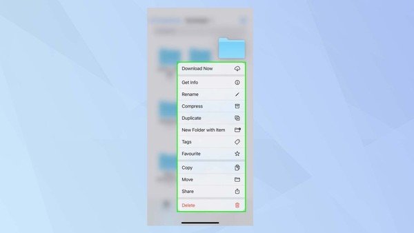 五、如果你长按文件夹,将看到更多选项,包括重命名、标记、复制、移动、共享和删除文件。如果文件在iCloud Drive中,你也可以将其保存到iPhone中,只需选择立即下载即可。