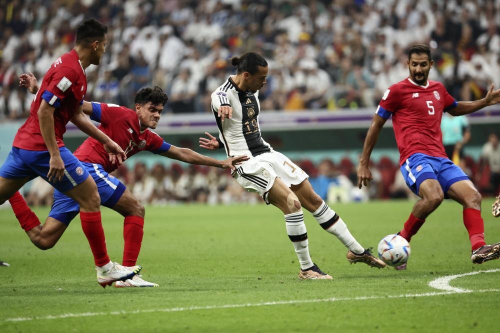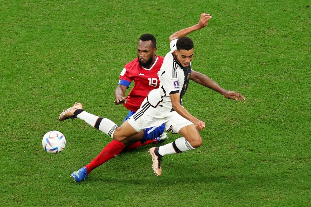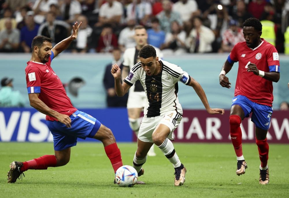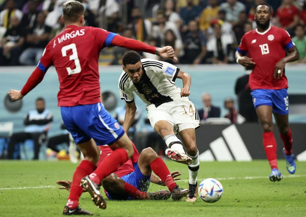 12月1日,德国队球员贾迈勒·穆夏拉(中)在比赛中拼抢。当日,在卡塔尔豪尔海湾球场进行的2022卡塔尔世界杯足球赛E组比赛中,德国队以4比2战胜哥斯达黎加队。 新华社记者 兰红光 摄