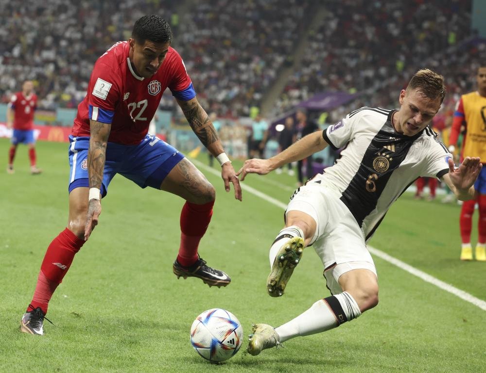 12月1日,德国队球员约书亚·基米希(右)与哥斯达黎加队球员马塔里塔在比赛中拼抢。 新华社记者 韩岩 摄