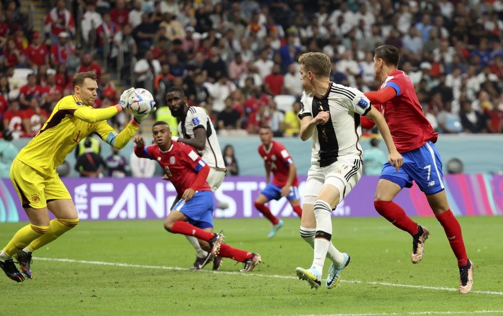 12月1日,德国队守门员曼努埃尔·诺伊尔(左一)在比赛中扑救。 新华社记者 韩岩 摄
