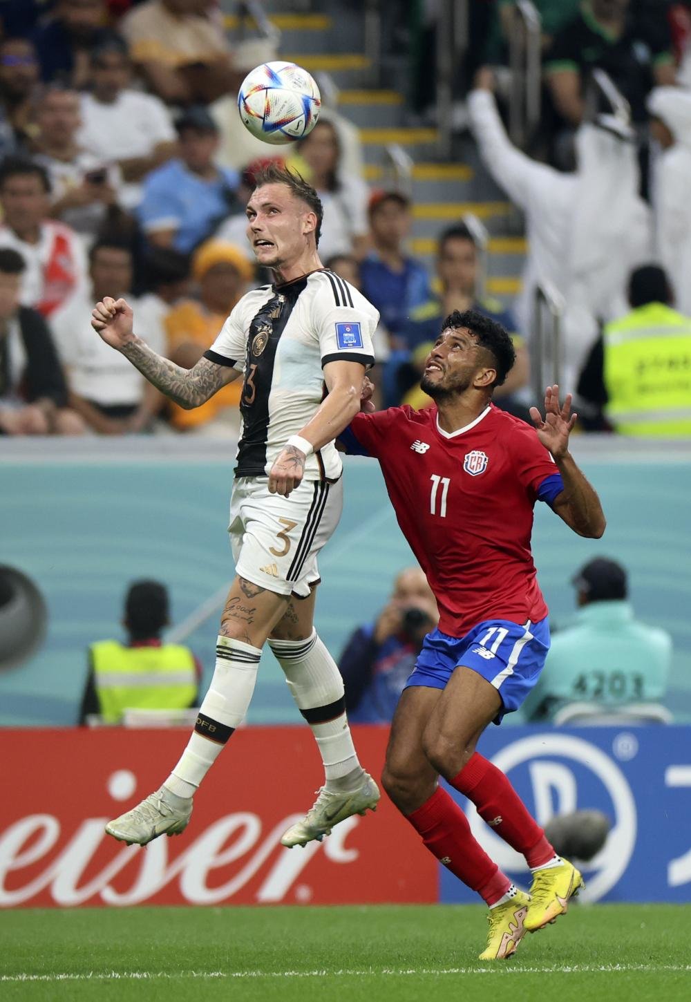 12月1日,德国队球员戴维·劳姆(左)与哥斯达黎加队球员贝内加斯在比赛中争顶。 新华社记者 李明 摄