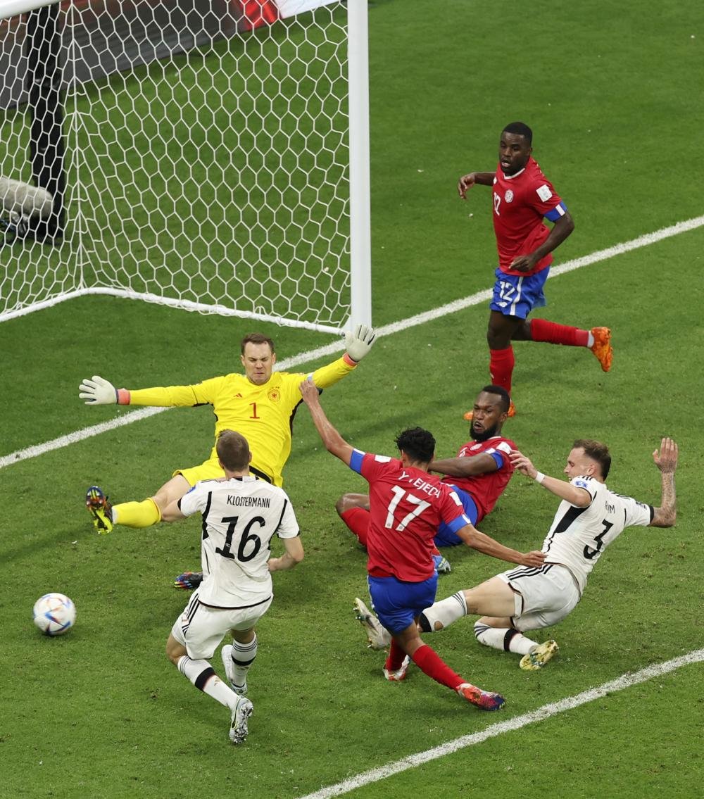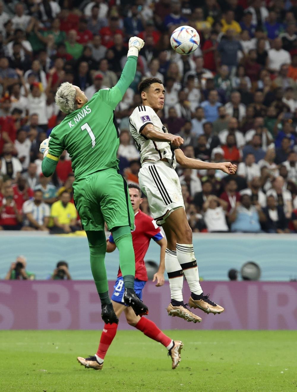 12月1日,哥斯达黎加队守门员纳瓦斯(左)与德国队球员贾迈勒·穆夏拉在比赛中拼抢。 新华社记者 韩岩 摄