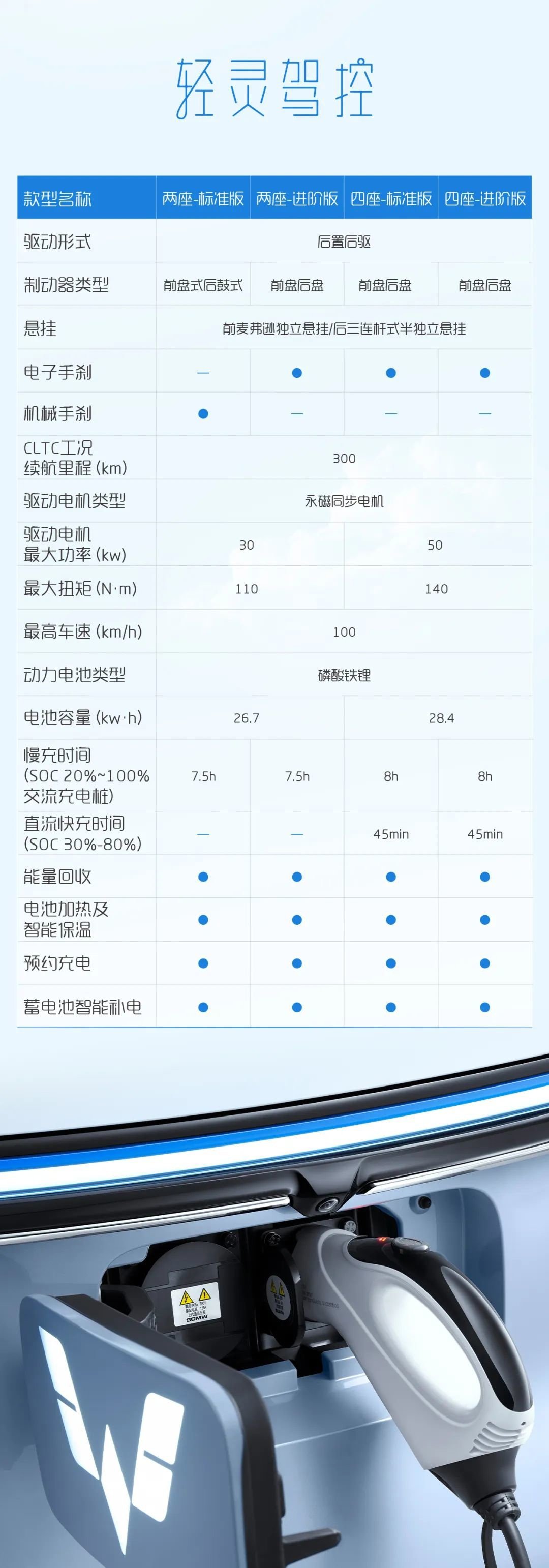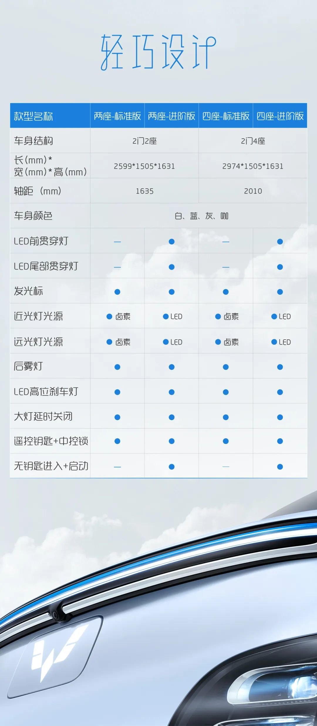 车身尺寸方面,新车长宽高分别为 2974mm / 1505mm / 1631mm,轴距为 2010mm,尺寸比宏光 MINIEV 稍大。动力方面,根据此前工信部的申报信息显示,新车将采用单电机布局,并配备磷酸铁锂电池,最大功率为 30kW,最高车速 100km / h。