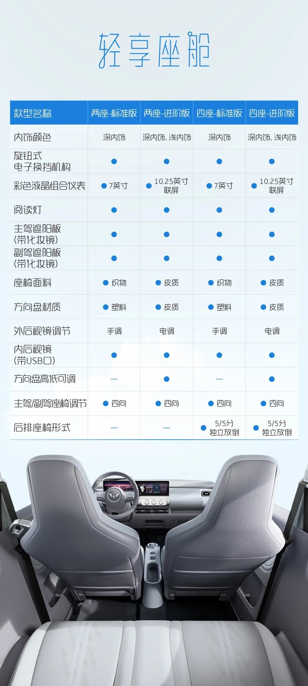座舱方面,Air ev 晴空提供两座、四座两种内饰布局,深浅双色内饰选择,进阶版搭配皮质座椅。新车主副驾支持四向调节;四座版后排座椅支持 5/5 分放倒和独立放倒,后备箱空间最大可达 704L。