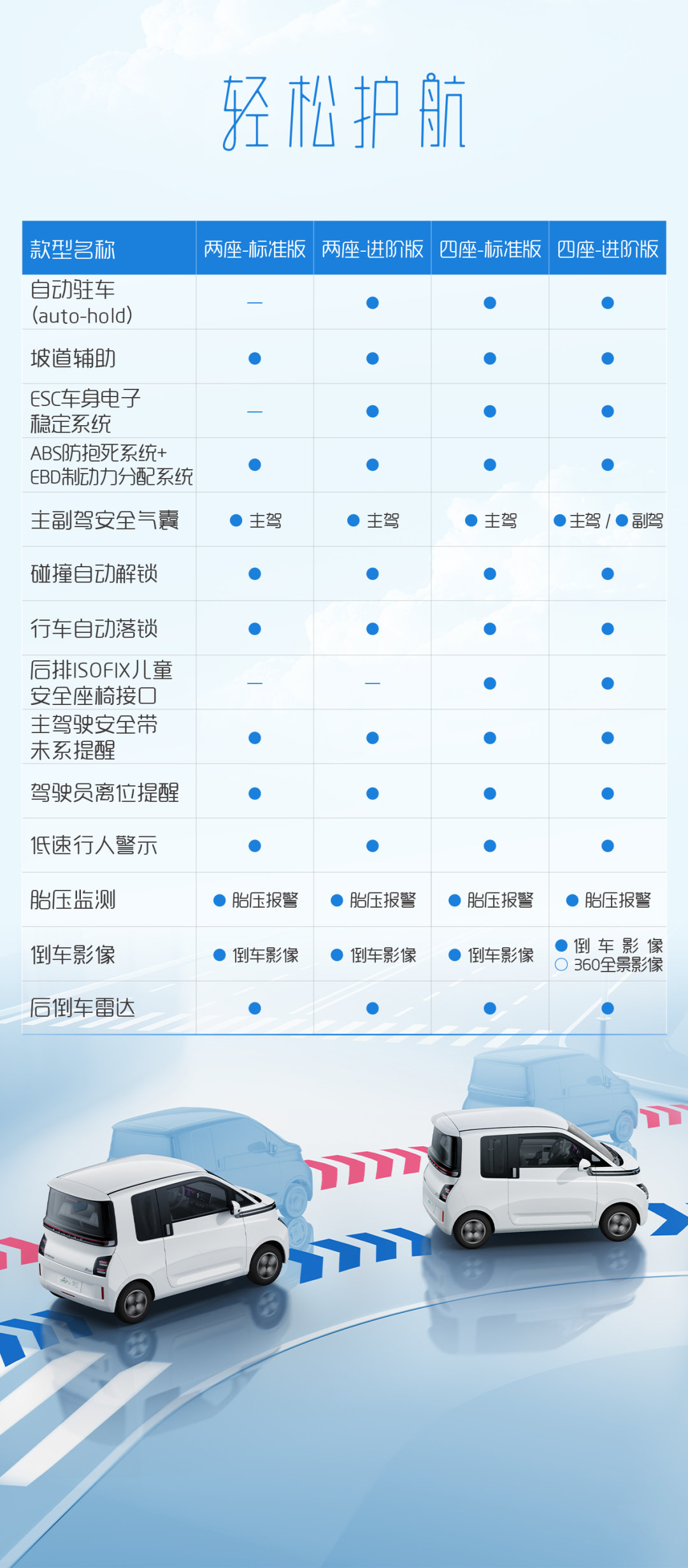 IT之家了解到,五菱表示,主动安全方面,新车配备了 ESC 车身电子稳定系统、ABS 防抱死系统 + EBD 制动力分配系统、胎压监测、自动驻车、坡道辅助等。被动安全方面,Air ev 晴空整车采用笼式车身结构,车架高强钢占比达 62%,并经过全车碰撞测试。