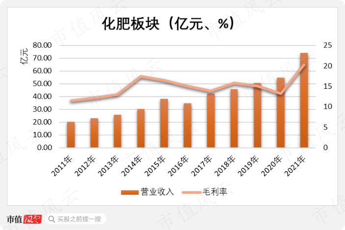 因此,云图控股的化肥业务在2021年实现营业收入74.08亿元,同比增长了20.20%,不论是规模还是增速,都是历史新高。