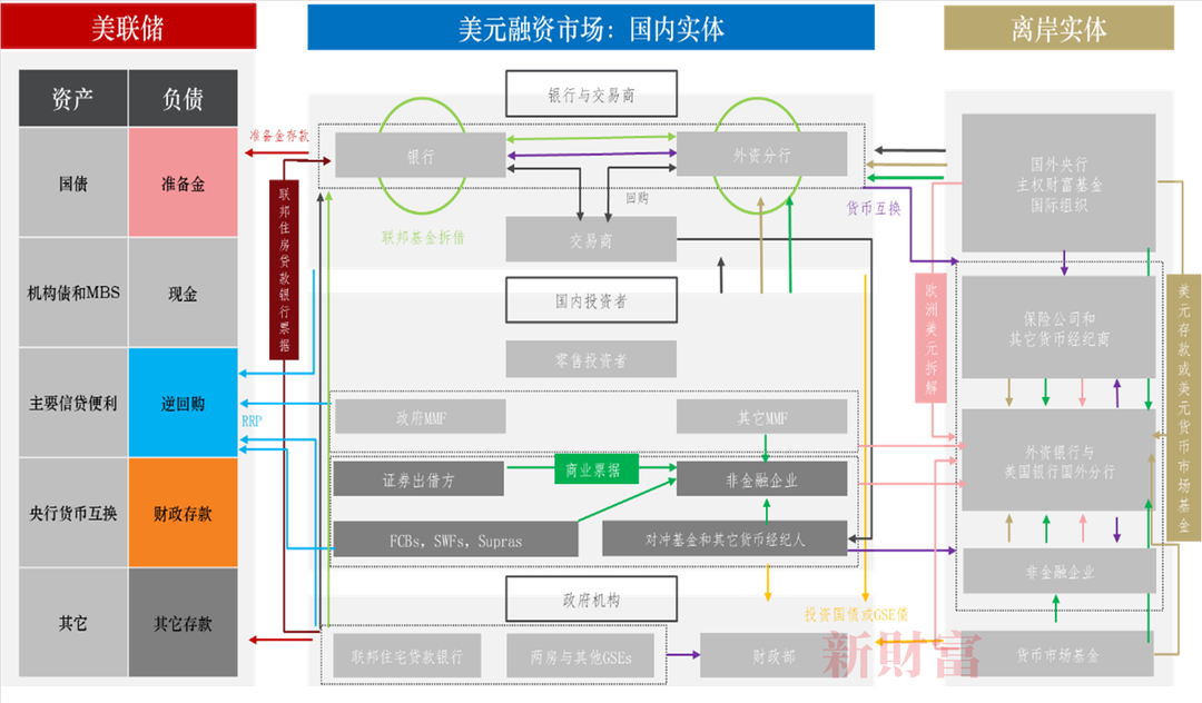 上世纪80年代末以来,以柏林墙倒塌和苏联解体为标志,两极对峙的格局瓦解,全球加速融合。以中国为代表的EMDEs依托全球化红利实现了经济高速增长。1992-2021年,美国的GDP份额(购买力平价)从19.6%降到了14.7%,EMDEs则从42.3%增加到57.9%。美元虽然面临着日元、欧元和人民币等货币的竞争,但其在全球贸易、融资、结算、定价等方面都发挥着主导作用,综合实力远超欧元。在已分配的外汇储备中,美元占59%;在国际银行业务中,美元资产和负债占61%;在欧洲以外地区,美元在出口贸易中的份额普遍超过70%(美洲96%,亚太74%,其他79%);美元现钞中的45%为“欧洲美元”;美国国债的42.4%是外国投资者持有的(美联储占25%)……美联储还与多家央行建立了常备互换业务,扮演着“全球央行”的角色,通过美元融资市场与国内外银行、非银行金融机构建立了直接的或间接的联系(图1)。