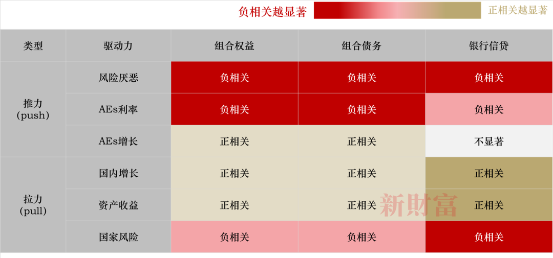 推力指的是促使投资者在母国以外寻找机会的因素,与资金供给有关,比如全球流动性(主要是AEs)、投资者风险偏好、本国经济增长、大宗商品价格和美元汇率等。