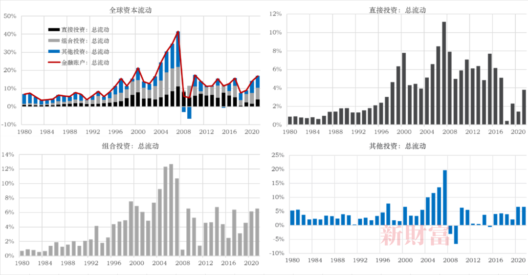 2008年金融危机后,全球资本流动规模可谓断崖式下降(中国除外)。2008年,总资本流动占全球GDP的比重为5.7%,2009年进一步下降到4.9%,2021年也只恢复到17%。不同种类资本流动的收缩并不对称,直接投资和其他投资的收缩最为显著,前者的“断点”出现在全球贸易冲突激化的2018年(0.4%),2021年升至3.8%,仍显著低于2007年的11.2%。其他投资(主要是银行信贷)在2008和2009年连续两年出现了负增长,其后大多数年份围绕在5%上下波动,仅为2007年的1/4。组合投资虽然在2008年骤降到了0.9%,但2009年就恢复到6.6%,2009-2021年的均值为5%。