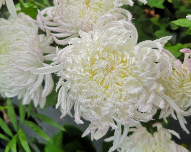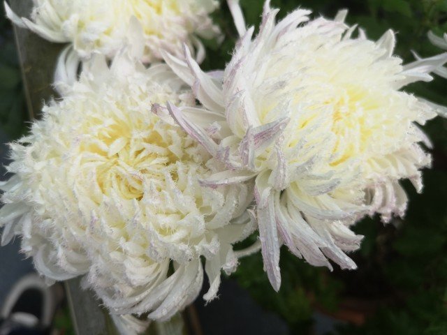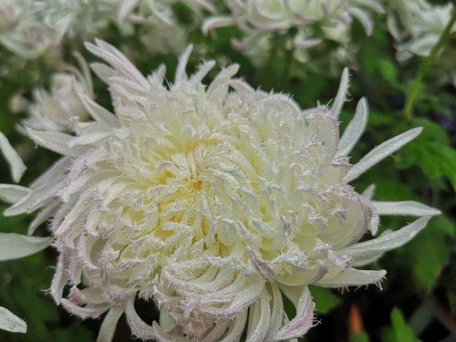 菊花琼岛三友,即白毛刺,开花像毛线球一样非常有质感。白毛刺,是毛刺类菊花中基本花型,花白色,花心黄色,舌状花中直管瓣多轮,开足呈扁平状。