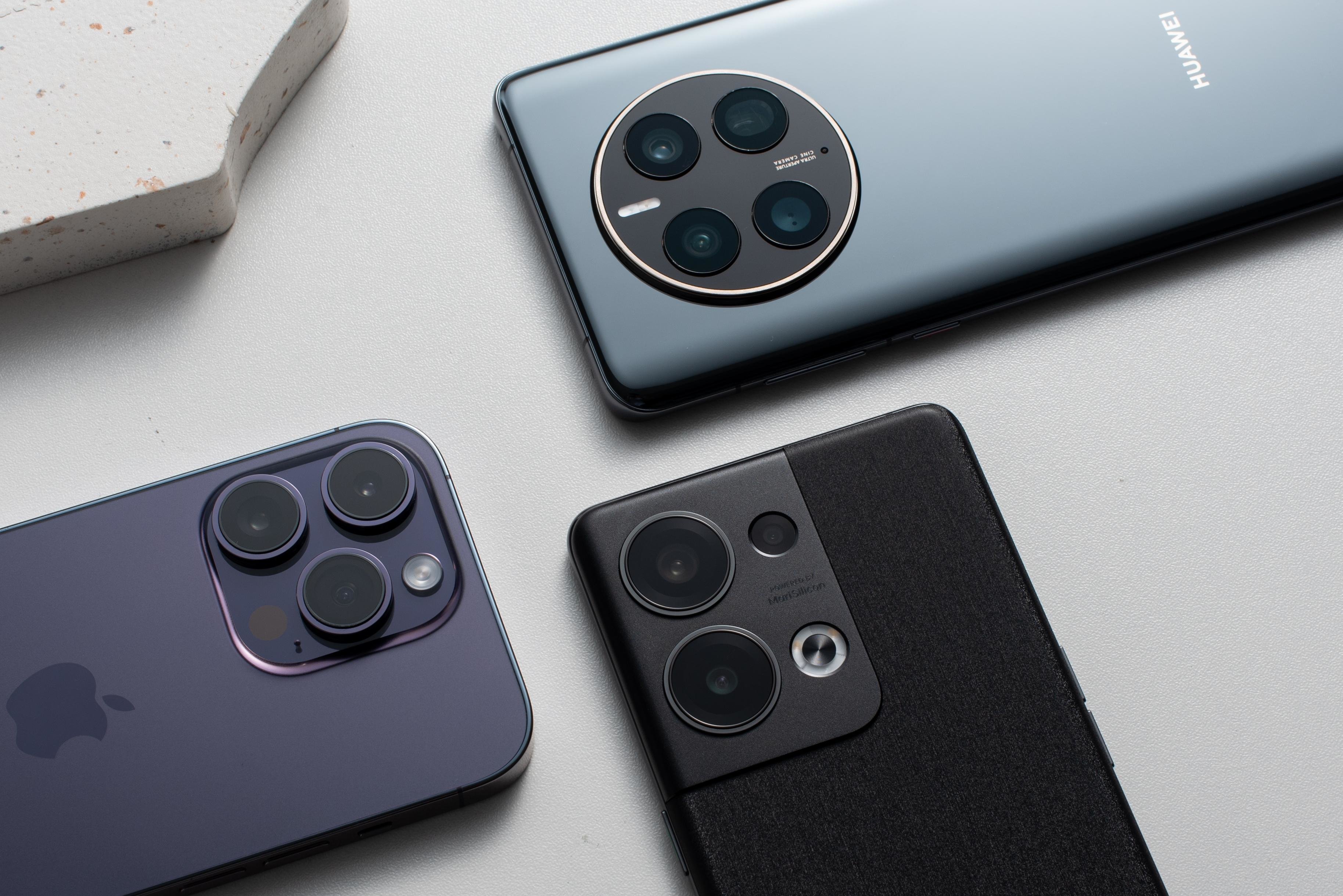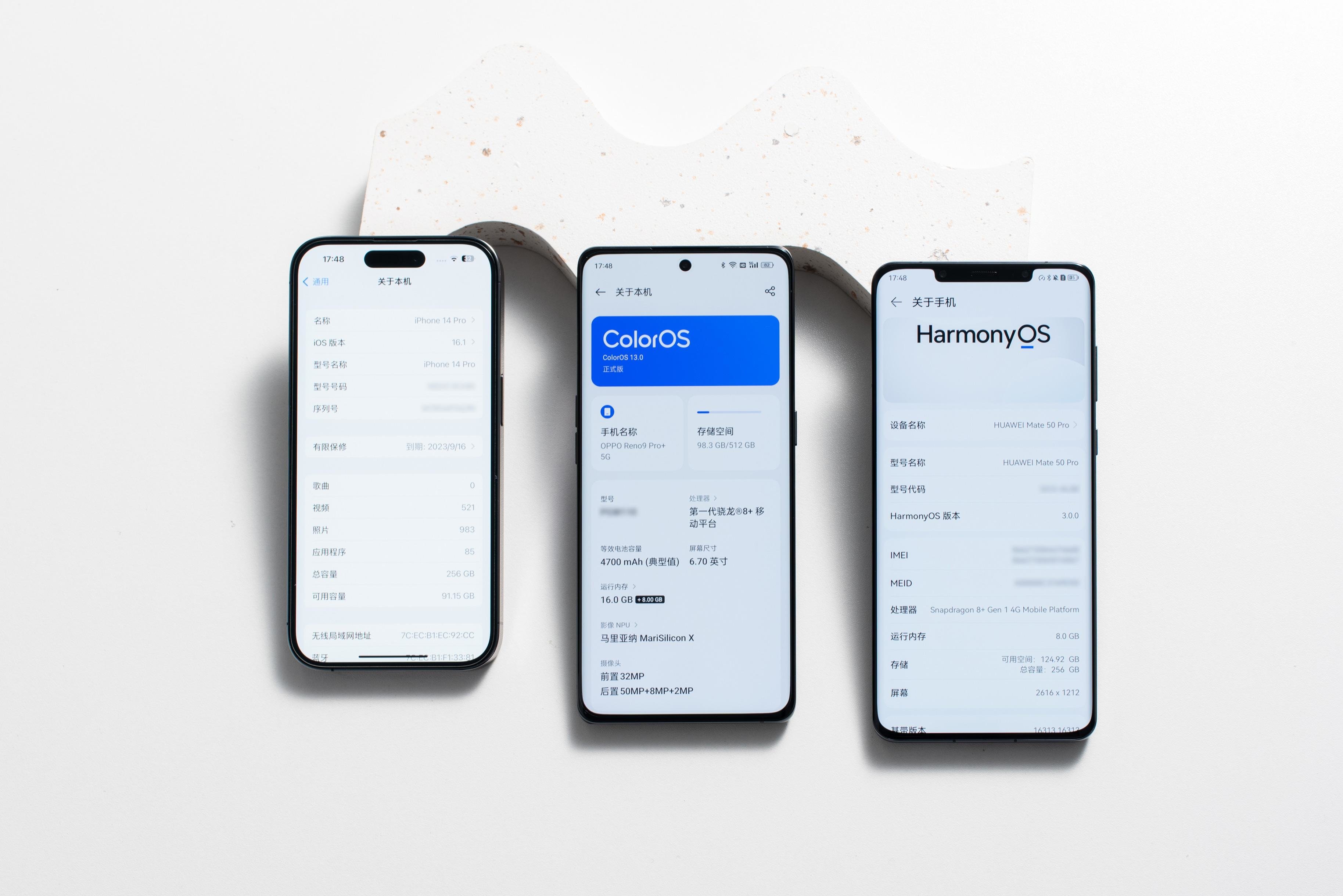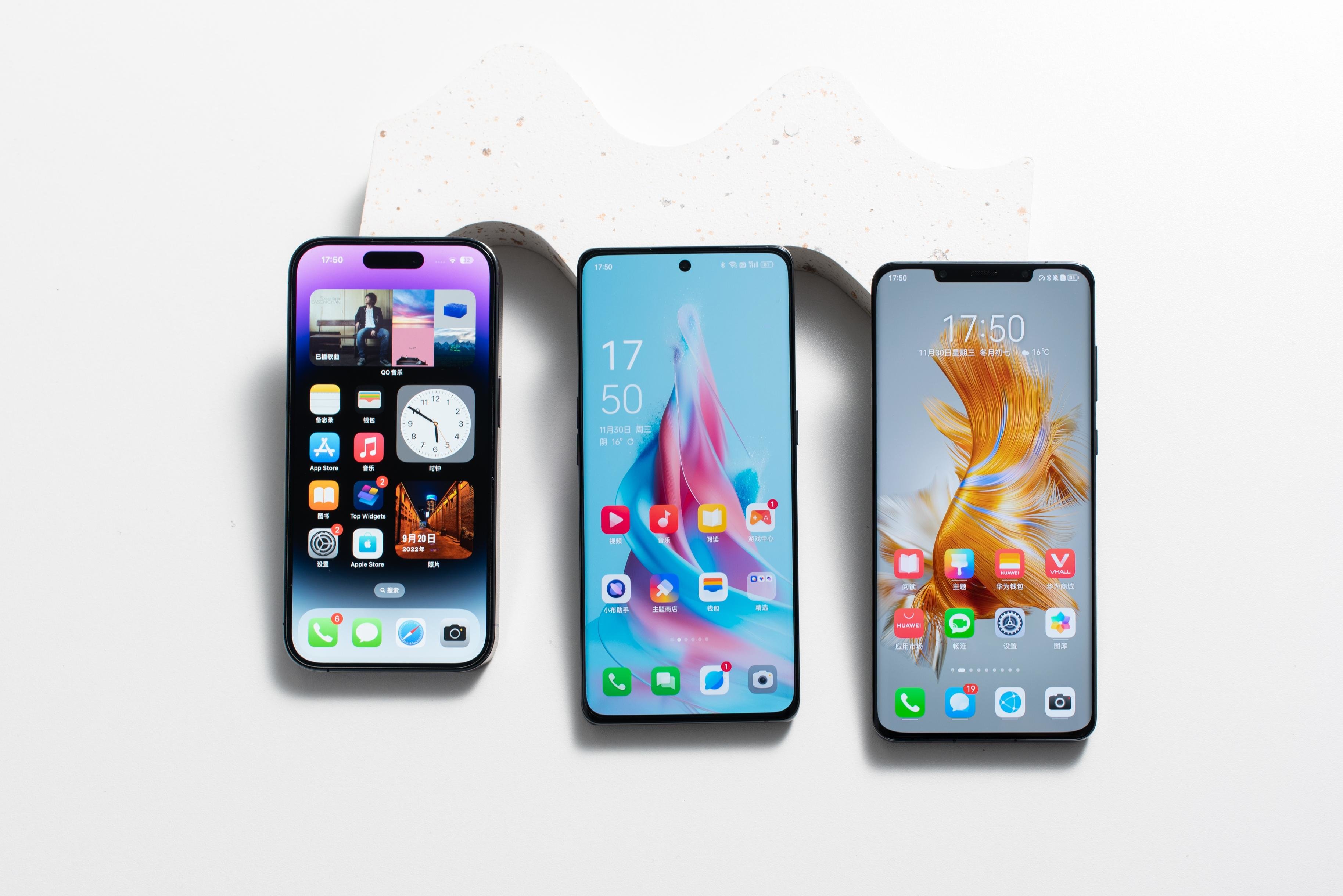 (从左到右:iPhone14 Pro、华为Mate50 Pro、OPPO Reno9 Pro+)