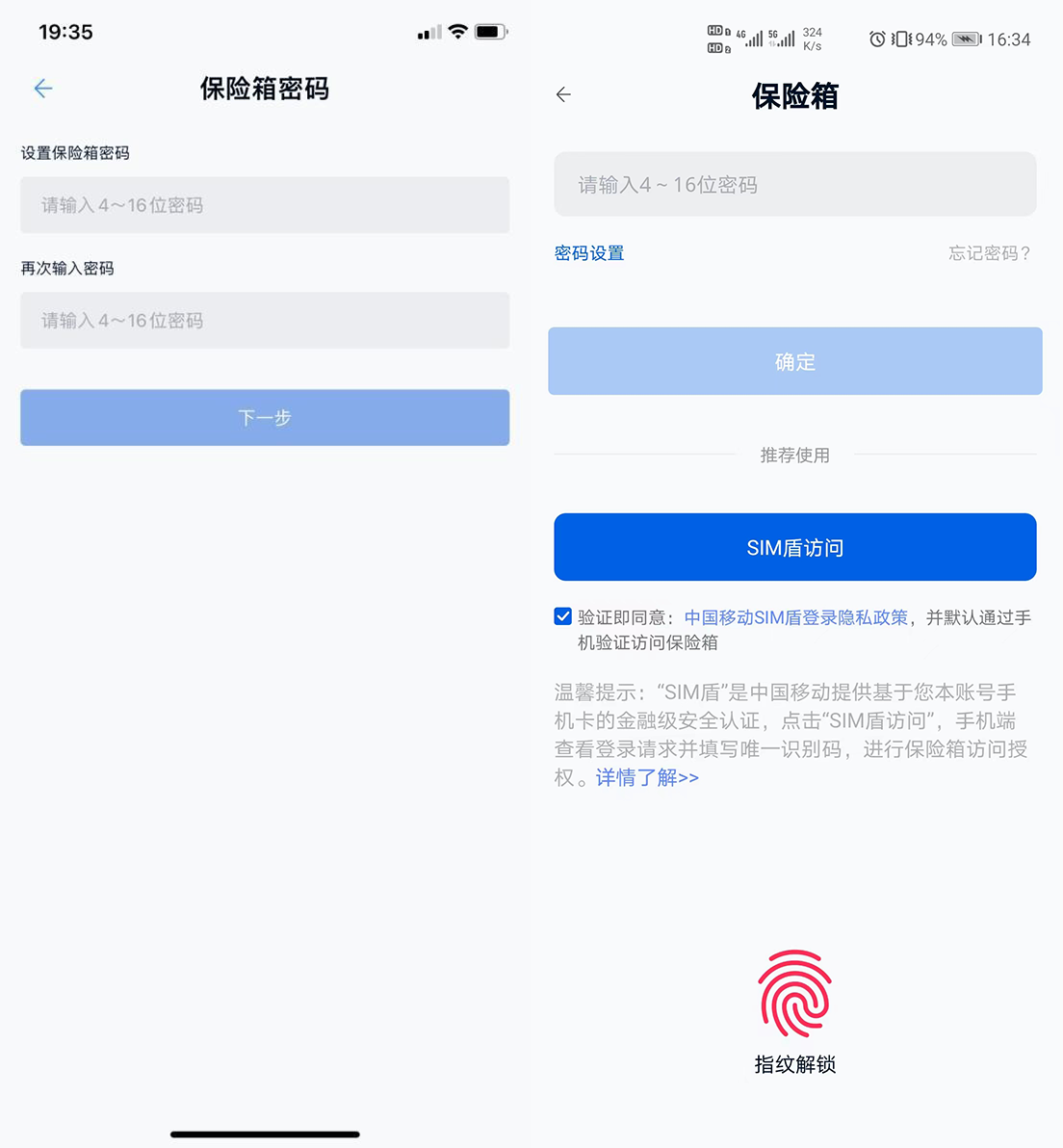 进了家里,重要的财产可以单独再上一个“保险箱”,保险箱需要独立的密码验证才可以打开,升级了SIM卡还能设置SIM盾加密,让人非常有安全感。