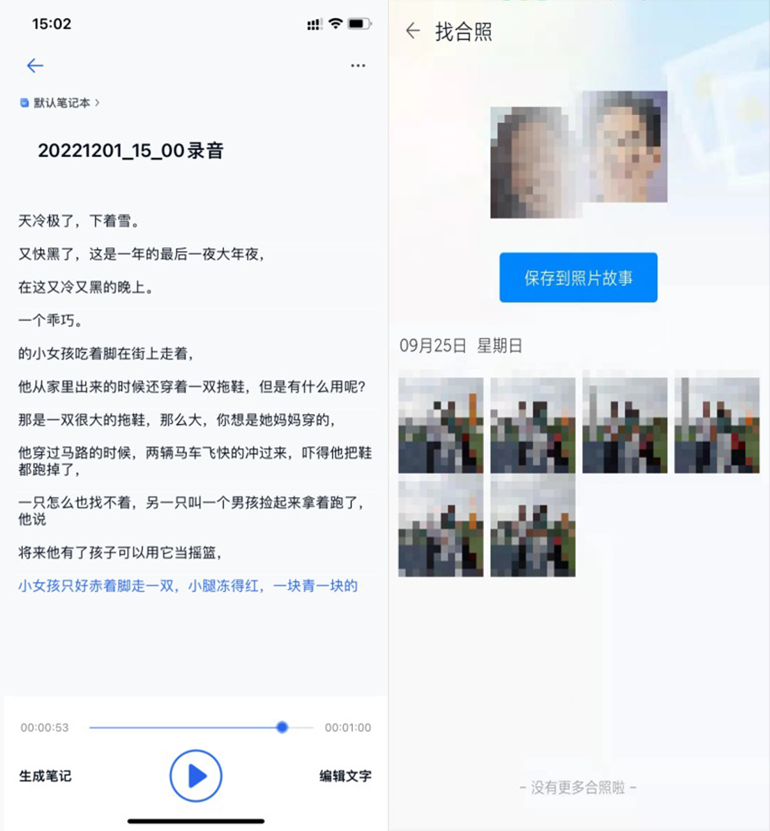 除基础的存储、备份、分享功能外,照片的AI识别分类、家庭云、多人共享群、云笔记等特色功能的表现,也是可圈可点。对家庭人群、职场人群来说,都非常实用。小雷在这里就不详细说了,下面是小雷体验中国移动云盘语音速记、找合照功能的截图,体验感很不错。