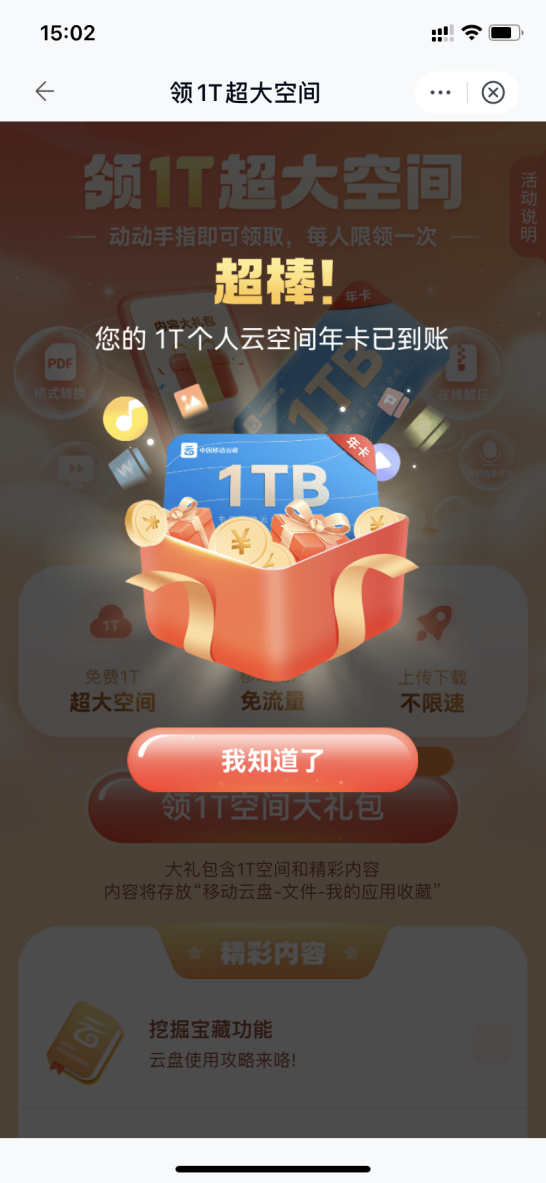 中国移动云盘的初始容量为20GB个人空间+20GB家庭空间(联通、电信手机号注册为10GB),能满足较基础的存储需求。而小雷简单参加了官方的一个转存文件活动,就获得1TB的体验年卡,一下子就有了免费的大存储空间,不光海量的图片、文档存储不在话下,即便是大体积的高清视频,基本也能做到想存就存。