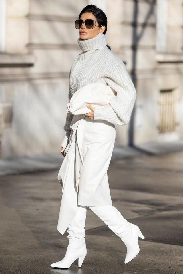 左图:一件白色的人造皮草大衣,可以增强节日气氛,非常适合新年穿搭,穿紧身衣和袜子,搭配靴子,不仅可以提升造型,还可以防止脚踝受凉。高领毛衣在里面放一条围巾,保暖度会大大提升,围巾的一瞥更增添了华丽的气息。