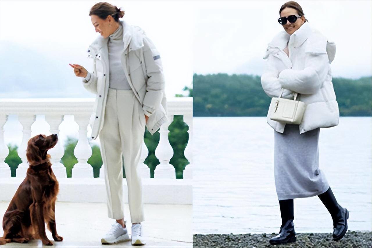 左图:超细纤维轻质羽绒服,乳白色和立体风帽,让脸看起来很漂亮。可开合地下摆两侧的按扣,营造出平衡感,内搭白色针织衫,与灰色裤装也很相配,一个白色斜跨包,带来俏皮感。