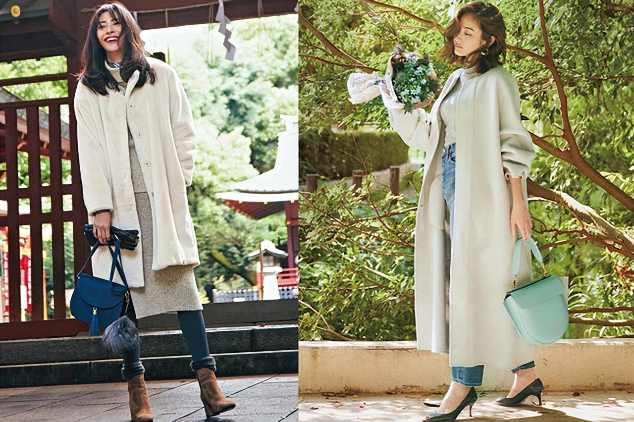 右图:容易显得厚重的大衣,选择浅米白色,搭配牛仔裤打造休闲造型,再搭配白色高领针织衫,体现出优雅的造型,时尚的蓝色手袋增添一丝丽人的都市气息。