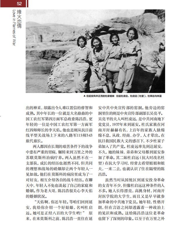“天佑啊,你还年轻。等咱们回到延安,我给你介绍一个好姑娘,名叫杜启远。她可是正经八百的大学生哟!” 原来,在来莫斯科之前,陈昌浩一直住在延安中共中央宣传部的窑洞。他旁边的窑洞里住的则是中央宣传部副部长吴亮平。吴亮平的夫人叫杜凌远,是中共河南地下党党员,1937年来到延安。杜氏家族在河南开封赫赫有名,上百年的家族人脉绵绵不息,从政、经商、办学,人才辈出。在抗日救国民族大义的感召下,不少杜家子弟加入了共产党。杜凌远率先到达延安,不久,她的妹妹、弟弟和父母都到延安参加了革命。其二妹杜启远(抗大时改名杜堃)在抗大学习时,经常去看望姐姐和姐夫,一来二去,也就认识了住在隔壁的陈昌浩。