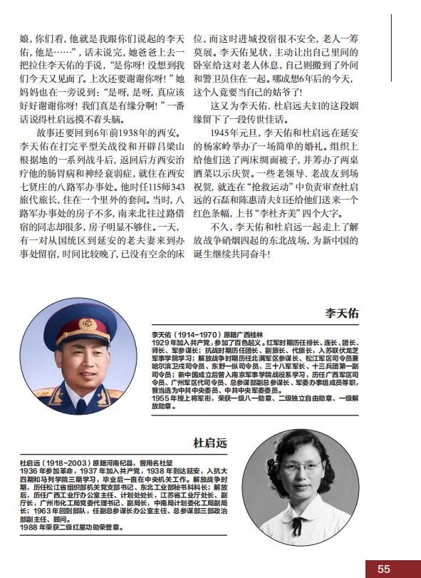 最后李天佑是如何认识了杜启远,如何见上了第一面,如何赢得了爱情呢?在老战友、老朋友中有不少说法,甚至称自己是月下老人,但年代久远,记忆飘逝,谁也说不清了。