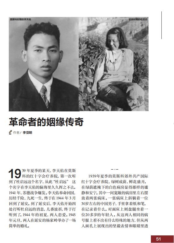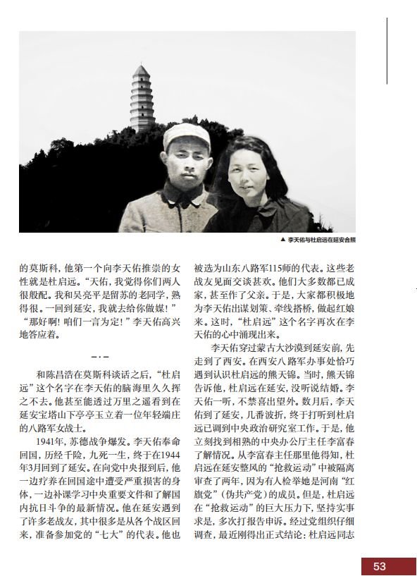 和陈昌浩在莫斯科谈话之后,“杜启远”这个名字在李天佑的脑海里久久挥之不去。他甚至能透过万里之遥看到在延安宝塔山下亭亭玉立着一位年轻端庄的八路军女战士。