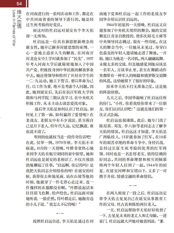 杜启远也很谨慎。此后,她专门找了陈琮英、邓发、李六如等老同志去了解李天佑的情况。杜启远这才知道,李天佑是广西临桂人,15岁就参加了红军。在10多年的艰苦卓绝的革命斗争中,身经百战,是经过长征生死考验的优秀的红军将领,同时也是一名忠厚老实,值得信赖的好同志。共同的革命理想和相互的倾慕将两个年轻人拉到了一起。1944年的初夏,在延安河畔和宝塔山下,又多了一对携手并肩,情感交融的革命情侣。