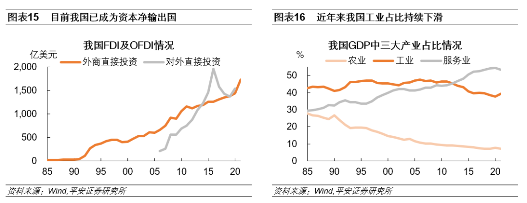 二、日本产业空心化有何表现?1)工业在整体经济中的比重不断下滑,服务业比重提升。2)对外直接投资不断增长。1985年开始,随着日本金融自由化的深入以及日元的大幅升值,日本对外直接投资迅速增加。2005年后,随着泡沫经济时期遗留的不良债权问题得到彻底解决,以及日本经济逐步回暖,企业对外投资意愿再度增强。3)外商直接投资低迷。房地产泡沫破裂后,日本经济持续低迷,陷入“失去的三十年”,而外商投资意愿也不断下滑,部分年份甚至出现外资撤出的情况。4)企业海外生产活动更加频繁。目前日本运输机械行业海外生产比率已达到44.4%,通信机械、通用机械以及传统的钢铁、化学等行业海外生产比率也相对较高。