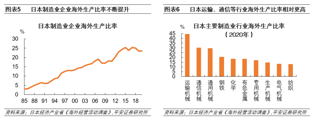 企业海外生产活动更加频繁。与日本国内产业空心化相对应的,日本企业开始更多选择在海外进行生产。根据日本经济产业省的海外经营活动调查,日本制造业企业海外生产比率由1985年的仅3.0%一路上升,在2017年、2018年一度突破25%。分行业来看,目前日本运输机械行业海外生产比率已达到44.4%,占比近半,而通信机械、通用机械以及传统的钢铁、化学等行业海外生产比率也相对较高。