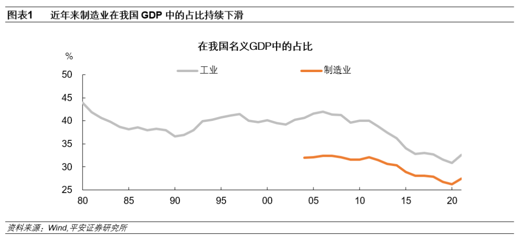党的二十大报告提出“高质量发展是全面建设社会主义现代化国家的首要任务”,并强调“建设现代化产业体系,坚持把发展经济的着力点放在实体经济上,推进新型工业化,加快建设制造强国、质量强国、航天强国、交通强国、网络强国、数字中国”。可见,制造业转型升级仍是我国高质量发展的重要驱动力之一,增强制造业竞争力、保持制造业比重稳定亦是新发展格局的重要一环。但近年来,制造业在我国经济中的占比开始出现下滑迹象,产业结构出现明显转变,对于我国“产业空心化”、“过早去工业化”的讨论逐渐升温。