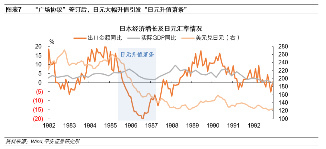 一是,“广场协议”后日元大幅升值,日本央行过度放松货币政策,在催生房地产泡沫的同时,也加快了日本国内产业结构调整。1985年9月,美国、日本、法国、英国及西德五国签订了“广场协议”,日本政府表示将“灵活管理货币政策,适当关注日元汇率”,并“使日元充分体现日本经济的内在实力”。“广场协议”签订后,日元大幅升值,引发“日元升值萧条”。1985年9月广场协议签订之时,美元兑日元汇率尚在240左右,而到1986年底则升值至160,升值幅度超过30%。日元大幅升值使得日本出口增速由1985年9月的-0.7%大幅回落至1986年8月的-20.9%,实际GDP同比增速由1985年四季度的7.5%降至1986年四季度的1.9%。日元过度升值,及其引发的日本经济下行,使得日本央行对当时的经济状况出现误判,货币政策操作过急过松,催生了其后的房地产泡沫。在1986年1月至1987年2月约一年的时间内,日本央行连续五次下调政策利率,将贴现率由6.0%降至2.5%的超低水平。