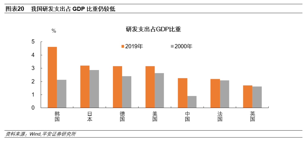 二是,加强自主创新能力,积极推动传统产业转型升级,提升实体经济投资回报率和制造业竞争力。与日本类似,我国在产业发展转型过程中也频繁使用了“吸收—消化—模仿”的战略。在产业发展的初级阶段,这一战略无疑能够加速工业化进程。但随着技术水平的进步以及国际环境的演变,从海外获取先进技术的难度明显增加,实体企业盈利难度增加,这时自主创新的重要性便开始显现。尽管近年来我国研发投入持续提升,但从研发投入占GDP比重这一相对指标来看,目前仍然低于韩国、日本、德国、美国等主要经济体。