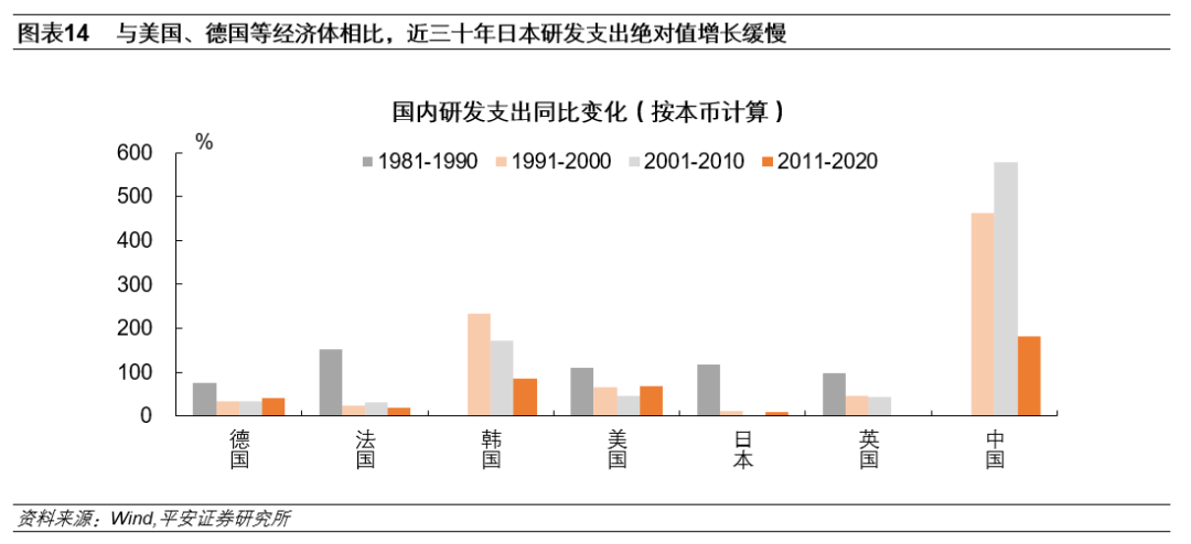 五是,1990年代初日本房地产泡沫破灭后,企业陷入“资产负债表衰退”,不仅设备投资意愿低迷,在研发方面的支出也停滞不前。1981年至1990年期间,日本国内研发支出增长了118.6%,增速高于美国(109.5%)、英国(99.1%)、德国(75.3%)。但资产泡沫破裂后的1991年-2000年,日本国内研发支出仅增长了11.1%,远低于同期的韩国(223.0%)、美国(67.0%)、英国(46.0%)、德国(34.3%)等。进入21世纪后,日本研发支出同样停滞不前,2001年至2010年期间甚至仅增长1.0%。