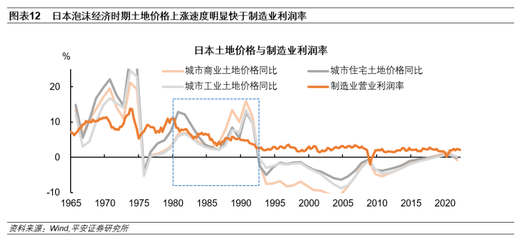 四是,产业逐渐向外转移后,实体经济的投资机会变少,在流动性较为宽松的条件下,过剩的资金势必涌入房地产和股票市场,亦助推了日本资产泡沫的膨胀。前文提到,资产价格的变动将会通过成本或信贷等渠道影响企业行为,进而影响产业结构,但日本房地产泡沫的膨胀与产业空心化现象的出现并非单纯的因果关系,二者实际上“互为因果”,产业空心化现象的出现也会助推房地产泡沫的膨胀。