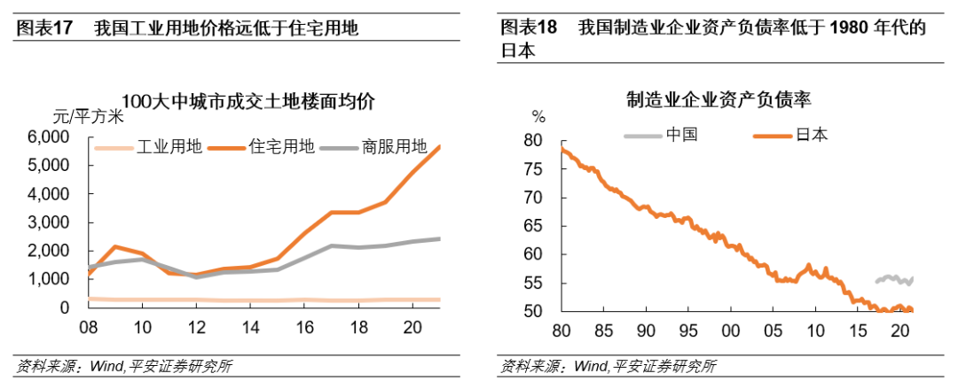 一是,保持房地产市场平稳发展,避免地产市场过快调整对制造业形成冲击。一方面,土地价格稳定有助于保持企业资产负债表健康,避免企业因“资产负债表衰退”导致创新能力下滑。企业作为经济系统中创新的主体,其研发活动对于产业的发展与转型至关重要。日本房地产泡沫破裂后,企业陷入资产负债表衰退,设备投资、研发支出停滞不前,成为阻碍日本产业升级的重要因素。与日本相比,我国企业出现资产负债表衰退的概率相对偏低:一方面,我国工业用地价格相对较低,土地在企业资产负债表中占比也较低,土地价格的调整对企业资产负债表的冲击更小;另一方面,尽管目前我国非金融企业部门杠杆率偏高,但其中实际上包含了城投主体的负债。在剔除城投有息负债后,2021年我国非金融企业杠杆率约为104.5%,明显低于泡沫经济时期的日本(1986年至1990年,日本非金融企业杠杆率均值为125.2%)。另外,从制造业企业资产负债率来看,当前我国制造业企业的资产负债率明显低于上世纪八九十年代的日本。