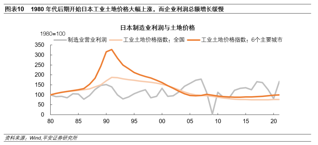 二是,土地价格上涨导致日本制造业企业的营业成本增加,盈利能力下降,企业向外转移的意愿更强。诸多研究表明,土地价格的上涨将对产业转移以及产业升级造成多种负面影响:土地价格上涨不仅直接提高了企业的经营成本,也将通过房租上涨——工资上涨等渠道间接影响企业的盈利能力。例如,Goodhart和Hofmann(2000) 提出,房价的过快上升提高了通货膨胀水平,增加了企业成本,且抑制了实体经济投资。1980年至1991年,日本制造业企业营业利润总额仅增长了39.5%,同期全国工业土地价格增幅达到86.9%,6个主要城市的增幅更是达到227.3%,可见,当时日本土地价格的上涨速度远快于企业利润的增长速度,导致企业扩产动力不足,而更有动力对外转移。另外,土地价格的上涨也会对企业的创新研发行为造成影响。例如,Miao & Wang(2012) 通过内生增长模型表明,企业投入存在泡沫的房地产等市场,会对原本主要业务的创新投入产生挤出效应。