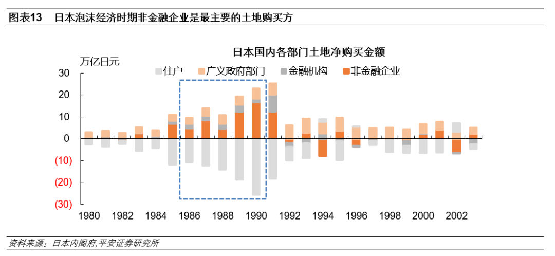 1979年末,日本制造业企业的营业利润率(营业利润/净资产)为10.8%,明显高于日本土地价格增速。但此后日本国内制造业营业利润率不断下滑,截至1990年末仅为4.79%。与此同时,日本土地价格不断上涨,尤其是在1985年后,日本土地价格同比增速开始大幅高于制造业营业利润率。土地投资收益率的上升导致企业有更强动力将资金投入房地产市场,而非用于正常的生产投资,这也在一定程度上加剧了房地产泡沫的膨胀程度。根据日本内阁府数据,非金融企业部门的土地购买金额由1980年的0.3万亿日元大幅增长至1990年的16.8万亿日元,即企业部门是日本房地产的主要购买者,而住户部门反而是当时土地的出售方。