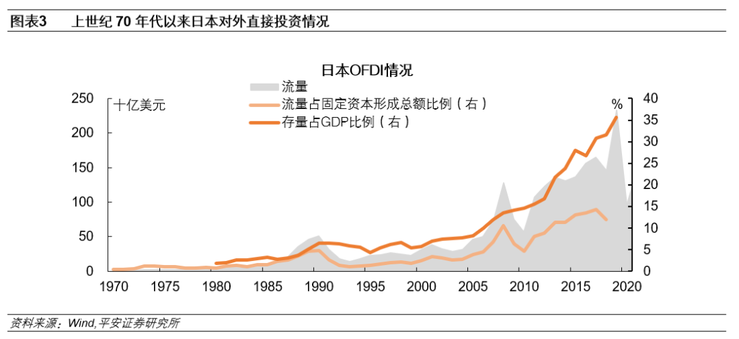 1990年代房地产泡沫破裂后,日本国内企业资产负债表受损,投资意愿大幅减弱,日本对外直接投资规模也出现下滑。但1993年开始,日本对外直接投资规模便开始触底回升。2005年开始,随着泡沫经济时期遗留的不良债权问题得到彻底解决,以及日本经济逐步回暖,企业对外投资意愿加速回暖。2005年至2008年,日本对外直接投资规模由457.8亿美元增至1280.2亿美元。尽管此后国际金融危机的爆发导致日本对外直接投资规模短暂回落,但2011年开始日本对外投资再度回升,并在2019年一度超过2000亿美元。