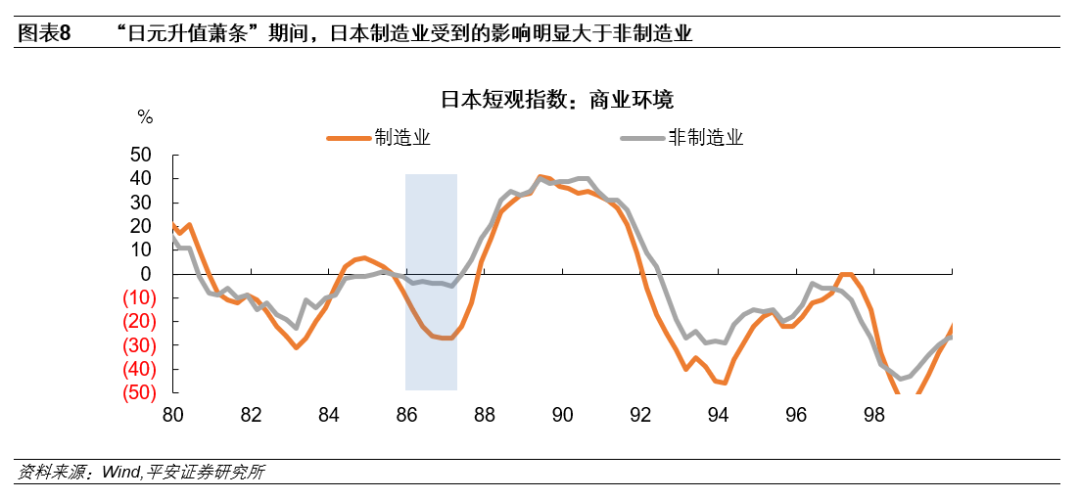 途径1:进出口贸易。日元汇率变动将直接影响日本的进出口贸易,即日元升值将削弱日本出口产品在国际市场上的竞争力,同时增强进口商品在日本国内市场上竞争力。这导致国内出口部门面临的需求下滑,企业生产意愿下降,进而导致日本国内的产业结构发生变化。尤其是,作为贸易部门的制造业受到的冲击要明显大于服务业等非贸易部门。从日本央行公布的短观指数(Tankan Index)来看,“日元升值萧条”期间日本制造业景气水平下滑程度明显高于非制造业,表明1980年代中期日元的大幅升值加重了日本产业空心化的程度。