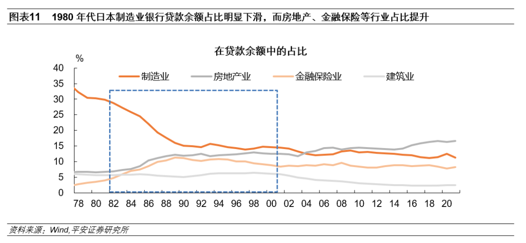 三是,房地产泡沫的膨胀导致银行信贷扭曲,进而引发日本产业结构调整。房地产泡沫的不断膨胀,会从多个方面影响银行的贷款行为:土地、建筑、不动产业由于其账面价格不断攀升,会被银行视为未来发展前景良好的优质放贷部门,导致银行对房地产行业的资金供给量大幅提高。而银行贷款向不动产业倾斜,对长期经济增长会产生明显的不利影响:一方面,大量资本经由银行系统进入不动产行业,极大地推动了土地泡沫的迅速膨胀,是促成日本泡沫经济的重要原因。另一方面,银行对制造业发放贷款数量减少。这其中虽有金融自由化推进导致“大企业远离银行”因素的影响,但从总体上看,日本制造业得到的金融支持相对减弱,这在一定程度上阻碍了未来实体经济的高质量发展。1980年代开始,日本新增贷款中投向制造业的比重不断降低,制造业在银行贷款余额中的占比由1980年的30.3%降至1990年的15.0%。与此同时,房地产业、建筑业和金融保险业三大行业在银行贷款余额中的占比由1980年的15.7%大幅增长至1990年的28.1%。