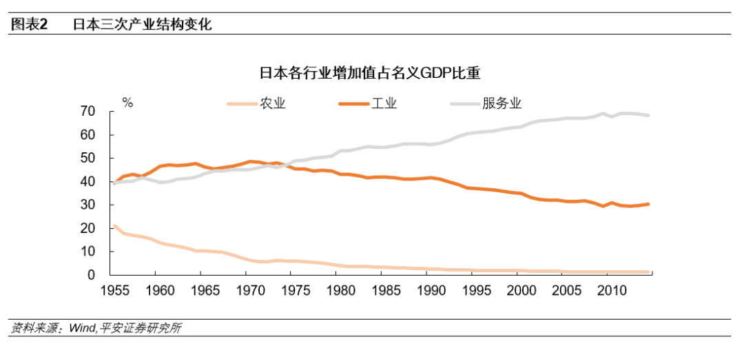 工业在整体经济中的比重不断下滑,服务业比重提升。二战后,随着日本经济高速发展,工业化水平不断提升。1955年至1970年,农业在日本GDP中的占比由21.0%大幅降至6.4%,而工业、服务业在日本GDP中的占比分别由39.3%、39.7%提升至48.6%、45.0%。自1970年代后期开始,农业在日本GDP中的占比继续下滑,但工业与服务业的占比却呈现出“此消彼长”的态势:服务业的份额不断提升,而工业的份额持续下滑。这一现象在房地产泡沫破裂后的1990年代表现的尤为明显:工业在日本GDP中的占比由1990年的41.6%,降至2009年的仅29.5%。