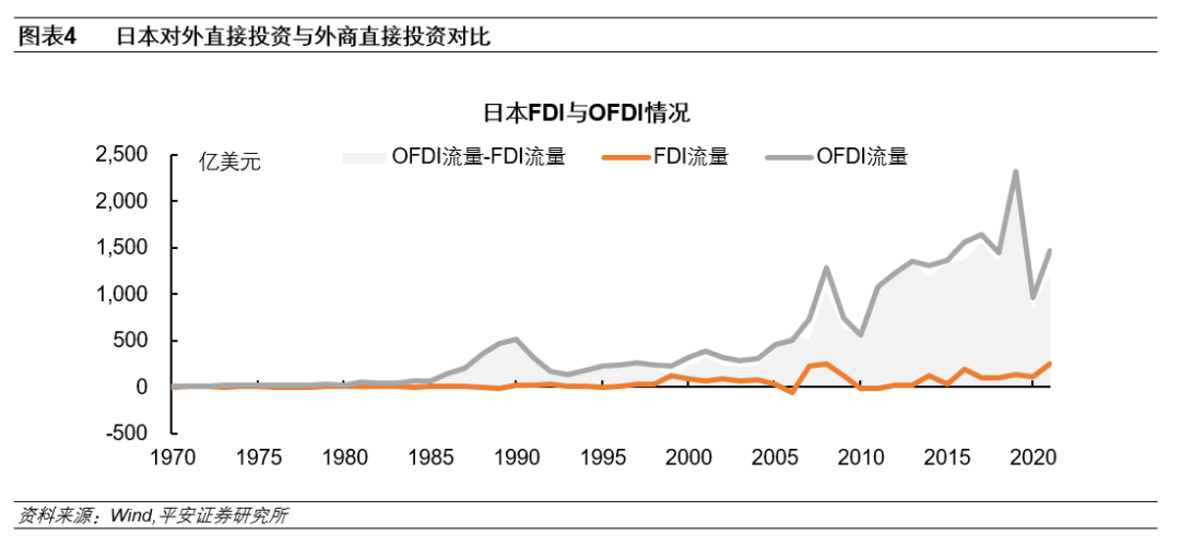 外商直接投资低迷。在日本企业大规模向外扩张的同时,外资企业在日本国内的投资却呈现出另一番景象:在行政手续较为复杂、优惠政策不足等因素限制下,日本经济的高速发展并没有吸引大量的外商直接投资。在房地产泡沫破裂后,日本经济持续低迷,陷入“失去的三十年”,而外商投资意愿也不断下滑,2006年等部分年份甚至出现外资撤出的情况。