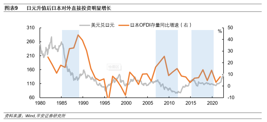 途径2:直接投资。根据相对成本效应理论,日元升值将直接提高外商在日本的生产成本,降低资本回报率,从而导致外商直接投资的减少。同时,日本本土企业在海外的生产成本将会降低,资本回报率提升,带动对外直接投资增加。此消彼长之下,日本制造业企业将不断向外转移,最终带来产业结构的调整,并导致“产业空心化”。历史上来看,1985年广场协议签订后、国际金融危机爆发后日元均出现明显升值,期间日本对外直接投资(OFDI)出现明显增长。而2015年至2019年,日元汇率稳中有升,日本对外直接投资亦有小幅回暖。