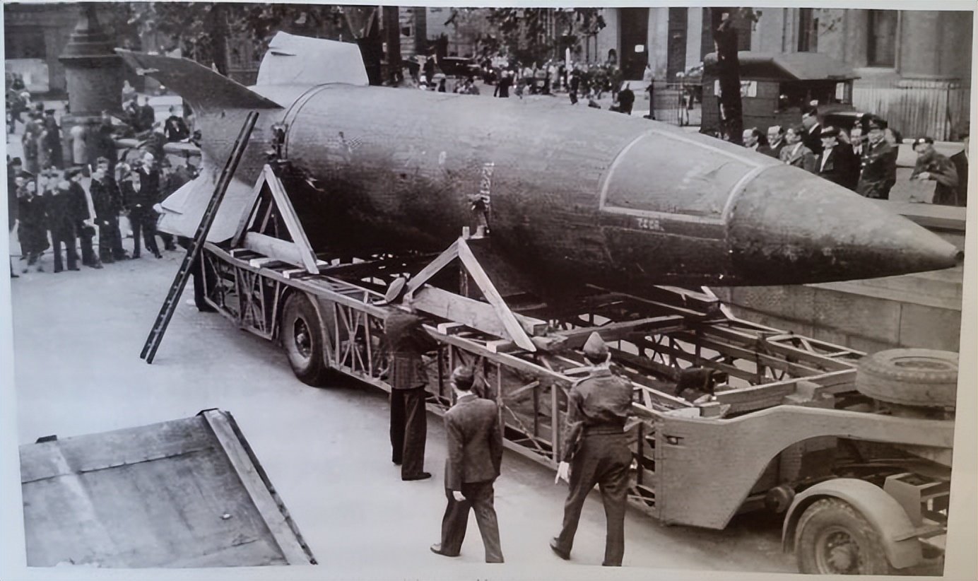 图为1945年9月,在英国特拉法加广场展出的V2火箭。