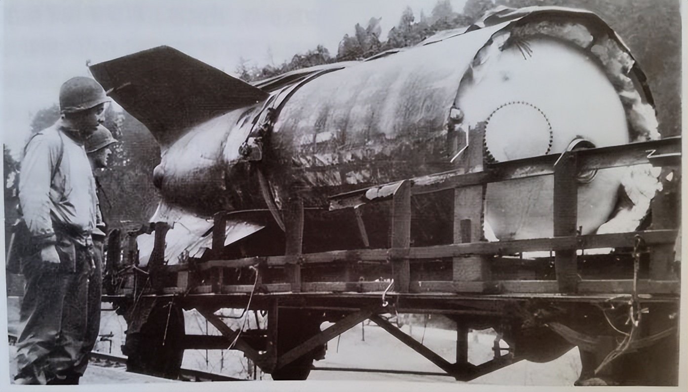 图为1945年4月,美军士兵正在查看美军俘获德国V2火箭。