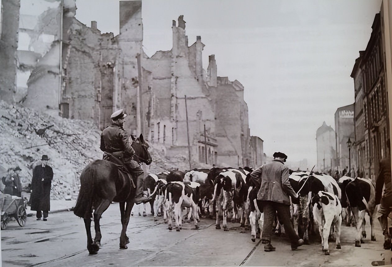 图为1945年10月23日,苏联士兵正押送德国战俘和一大群牛经过波兰火车站,准备运送到苏联。战后的波兰城市破败不堪。也不知道这些苏联士兵从哪里找到那么多牛。