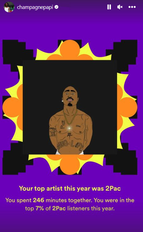 Drake分享了自己的Spotify年度报告,2Pac是他今年收听时间最长的艺人。