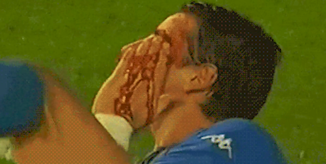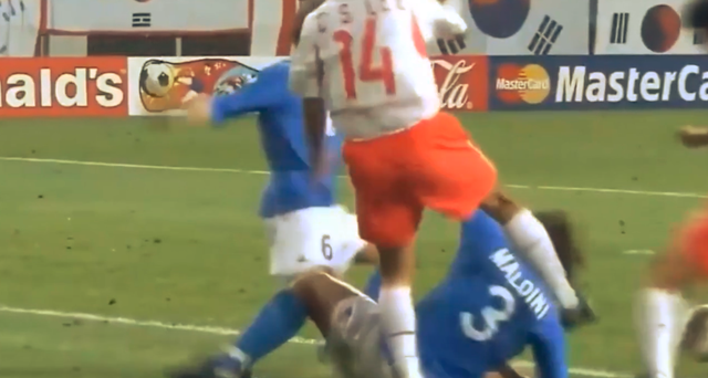 在1/8决赛中,韩国队VS战意大利队。赛场上韩国队充分发挥了卑劣的体育竞技手段,多次恶意犯规,裁判吹黑哨。甚至韩国队队员在意大利球员科科摔倒之后,直接对准头狠踢一脚,造成了2002年世界杯最严重的流血事件。在这场比赛中,韩国击败意大利,挺进4强。