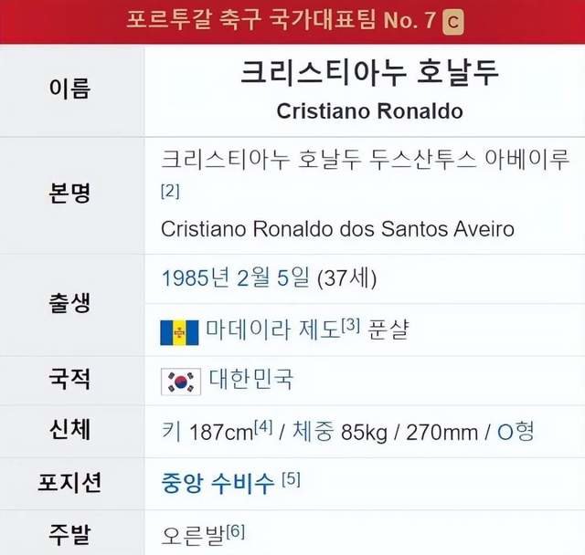 更离谱的还在后面,韩国网友在可以更改的百科网站上,将C罗的国籍改成了韩国。