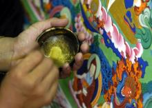 唐卡画师是把唐卡绘画需要的所有颜料分为九类:土、石、水、火、木、草、花、骨和宝石。