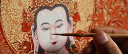 9、开脸:开眉眼包括画眼睛、嘴唇、鼻孔、手足指甲等,是唐卡绘制过程中最后一道工序,也是最重要的一步,一幅唐卡的成败,往往取决于眉眼开得是否成功。所以部分老艺人将开眉眼的功夫当作绝技,单脉相传,不轻易示人。按传统习俗,开眼要选良辰吉日。开好眉眼,就能起到画龙点睛的作用,同时预示着一幅唐卡的最终竣工 。